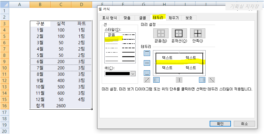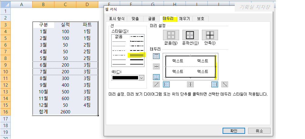 ③ 테두리 탭에서 점선, 검은색, 중간가로선 클릭 후, 확인을 눌러줍니다.
