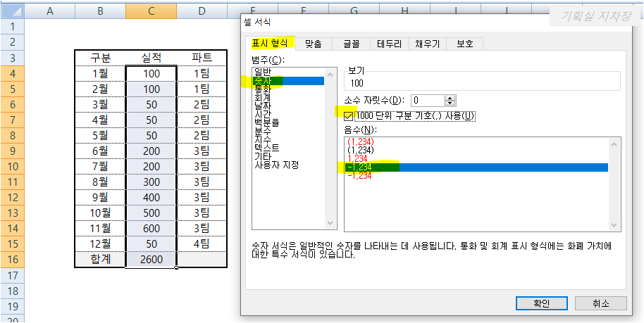 ③ 표시형식 탭에서 숫자, 1000단위 구분 기호 사용, 서식 클릭 후, 확인을 눌러줍니다.