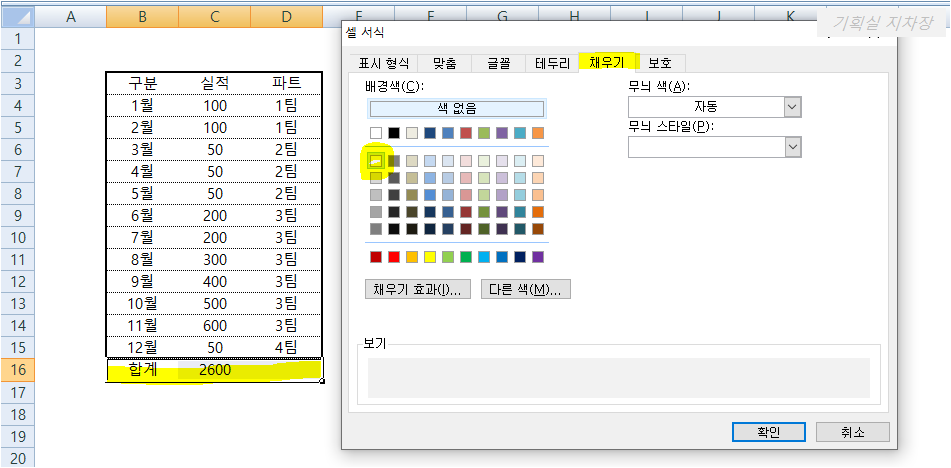 ③ 채우기 탭에서 점선, 회색 클릭 후, 확인을 눌러줍니다.